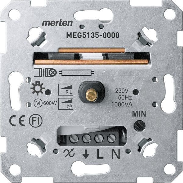 Für dimmbare, gewickelte Trafos, Glühlampen und 230 V-Halogenlampen (induktive/ohmsche Last). (Phasenanschnitt). Mit Druck-Ausschalter. Nennleistung 60-1000 VA. Motor Last 60-600 VA. Neutralleiter erforderlich. Zu komplettieren mit Zentralplatte mit Drehknopf System M MEG5250-03xx/-04xx/-06xx Zentralplatte mit transparenter Abdeckung und Drehknopf M-Creativ MEG5250-3500. Zentralplatte mit Drehknopf System Design MEG5250-60xx, System Fläche MEG5250-40xx/-41xx/-42xx Hinweis Informationen zum Thema Dimmen von LED Leuchtmittelnerhalten Sie im Internet unter Merten Dimmertest. http//www.merten.de/Dimmer-Test.dimmertest.0.html. Ausführung 60-1000 VA.