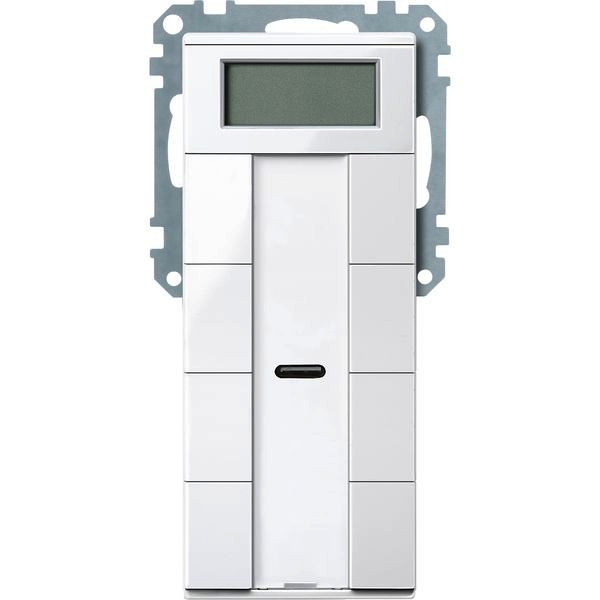 Steuereinheit mit Bedientasten, Betriebs/-Statusazeige und Schriftfeld, die Betriebsanzeige kann auch als Orientierungslicht verwendet werden, Funktionen der Tasten können mit IR-Fernbedienung angesteuert werden (bereits vorprogrammiert) Im Design System M. Komfortable Steuerungseinheit mit 8 Bedientasten, Betriebs-, Statusanzeige und Schriftfeld. Die Betriebsanzeige kann auch als Orientierungslicht verwendet werden. Mit Raumtemperaturregler und Display. Mit integriertem Piezo-Summer zur Anzeige von Alarmzuständen und IR-Empfänger. Mittels IR-Fernbedienung können alle Funktionen der jeweiligen Tasten angesteuert werden. Mit 9 roten LEDs. Der Raumtemperaturregler ist für Heizung und Kühlung mit stufenlos verstellbaren KNX-Stellantrieben oder zur Ansteuerung von Schaltaktoren und Heizungsaktoren verwendbar. Mit weiß hinterleuchtetem Display zur Darstellung von z. B. Uhrzeit, Datum, Temperatur und Betriebsmodus. Menü zur Einstellung von Standard-Betriebsarten, Sollwert, Arbeitstag/arbeitsfreier Tag (externe Ansteuerung), Anzeigemodus, Uhrzeit, Schaltzeiten und Helligkeit des Displays. Die Tasten sind als Tastenpaar (zweiflächig) oder als Einzeltasten frei parametrierbar. Mit integriertem Busankoppler. Der Busanschluss erfolgt über eine Busanschlussklemme. Softwarefunktionen KNX Funktionen Taster Schalten, Umschalten, Dimmen, Jalousie (relativ oder absolut), Flanken löst 1,- 2-, 4- oder 8-Bit-Telegramme aus (Unterscheidung kurze/lange Betätigung). Flanken mit 2-Byte-Telegrammen (Unterscheidung kurze/lange Betätigung), 8-Bit-Schieberegler, Szenenabruf, Szenenspeicherung, Sperrfunktion. Zeitsteuerung mit Synchronisation, Meldefunktion, Externen Temperaturwert zyklisch lesen, Ventilatorsteuerung, Betriebsarten, Sollwertverschiebung. Funktionen Raumtemperaturregler Reglertyp 2-Punkt-Regelung, stetige PI-Regelung, schaltende PI-Regelung (PWM). Ausgang Stetig im Bereich 0-100% oder schaltend EIN/AUS. Regler-Mode -Heizen mit einem Reglerausgang. Kühlen mit einem Reglerausgang. Heizen und Kühlen mit getrennten Reglerausgängen. Heizen und Kühlen mit einem Reglerausgang. 2-stufiges Heizen mit 2 Reglerausgängen. 2-stufiges Kühlen mit 2 Reglerausgängen. 2-stufiges Heizen und Kühlen mit 4 Reglerausgängen. Betriebsarten Komfort, Komfortverlängerung, Standby, Nachtabsenkung, Frost-/Hitzeschutz. Schieben aller Sollwerte. Speichern aller Solltemperaturen und Betriebsarten bei Reset. Überwachung externer Temperatur. Zusätzliche Ausgabe der Stellgröße als 1-Byte Wert bei PWM. Meldefunktion für Isttemperatur, Ventilschutzfunktionxx Szenenfunktion. Bedienung Menü. Zu komplettieren mit 1-M-Rahmen, 2fach ohne Mittelsteg 3898xx ATELIER-M-Rahmen, 2fach ohne Mittelsteg 3888xx M-SMART-Rahmen, 2fach ohne Mittelsteg 4788xx, 4848xx. M-PLAN-Rahmen, 2fach ohne Mittelsteg 4888xx, 5158xx M-PLAN-Echtglasrahmen, 2fach ohne Mittelsteg 4878xx M-PLAN-Metallrahmen, 2fach ohne Mittelsteg 4758xx Sender IR-Universalfernbedienung MEG5761-0000. Funk-Universalfernbedienung CONNECT MEG5051-0000. Lieferumfang Mit Busanschlussklemme und Tragplatte. Mit Schraube für Demontageschutz. Mit Putzschutzhaube. Material Thermoplast brillant. Farbe polarweiß glänzend.