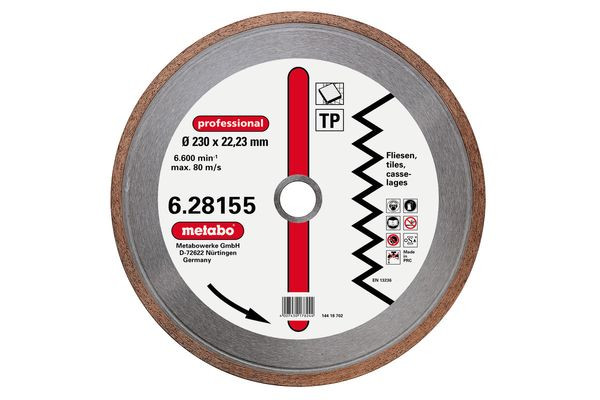 | Kurzbeschreibung | Diamant-Trennscheibe, 230 x 1,7 x 22,23 mm, "professional", "TP", Fliese (628155000) |