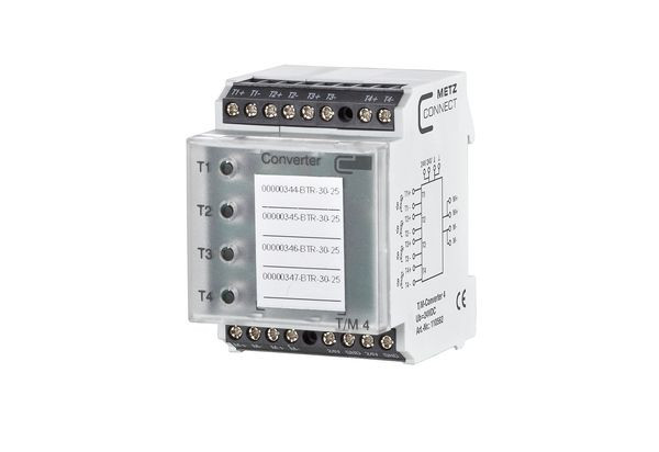 Temperaturkonverter zum Anschluss von bis zu 4 unterschiedlichen Widerstands-Temperatursensoren in Zweileitertechnik mit einer Auflösung in 0,1 Kelvin. Die Adressierung der 4 Temperatursensoren erfolgt über 4 M-Bus Adressen nach M-Bus Norm DIN EN 1434-3. Die Temperaturumrechnung erfolgt direkt im Gerät. Der Temperaturkonverter belegt 4 werkseitig fest eingestellte M-Bus Adressen. Je Kanal kann eine von 11 hinterlegten Temperatursensorkennlinien mit dem M-Bus Konfigurationstool (www.metz-connect.com) eingestellt oder der Widerstandswert direkt übermittelt werden. Der Leitungslängenabgleich erfolgt über einen dem Temperatureingang zugeordneten Taster. Die Werkseinstellung: -30 °C bis 130 °C / PT1000.Anschluss mit Schraubklemmen