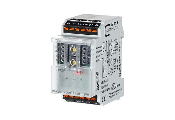 Das Modbus-Modul mit 4 digitalen Eingängen wurde für dezentrale Schaltaufgaben entwickelt. Es ist geeignet zur Erfassung von potentialfreien Schalterzuständen, z. B. elektrische Endlagenschalter an Lüftungsklappen oder Hilfskontakte bei Leistungsschützen. Die Eingänge können mittels potentialfreien Schaltern oder Kontakten sowie als Spannungseingänge beschaltet werden. Über einen Modbus-Master können die Eingänge über Standard-Register abgefragt werden. Die Adressierung des Moduls, die Einstellung der Bitrate und Parität erfolgt über 2 Adressschalter auf der Frontseite oder per Software. Geeignet zur dezentralen Montage auf Tragschiene TH35 nach IEC 60715 in Elektroverteilern.Anschluss mit Federkraftklemmen (Push-In)