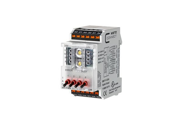 Das BACnet MS/TP-Modul mit 4 digitalen Ausgängen wurde für dezentrale Schaltaufgaben entwickelt. Es ist geeignet zum Schalten elektrischer Komponenten, z. B. Motoren, Schütze, Lampen, Jalousien usw. Hierbei sind die Relaiskontakte durch geeignete lastabhängige Maßnahmen zu schützen. Das Modul verfügt über eine Handbedienebene mit der die Relais manuell geschaltet werden können. Über einen BACnet-Client können die Ausgänge über Standard-Objekte geschaltet werden. Die Adressierung des Moduls und die Einstellung der Bitrate erfolgt über zwei Adressschalter auf der Frontseite. Geeignet zur dezentralen Montage auf Tragschiene TH35 nach IEC 60715 in Elektroverteilern.Anschluss mit Federkraftklemmen (Push-In)