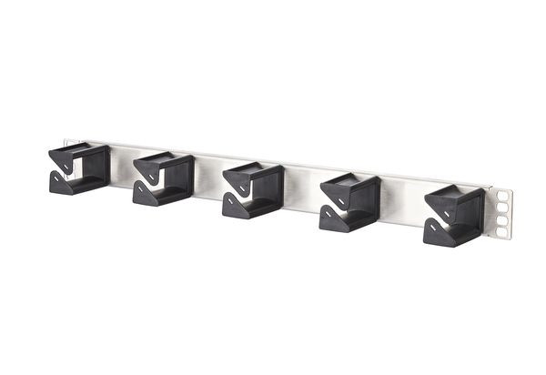 Rangierfeld 19 Zoll 1HE, Kabelmanagement zum horizontalen rangieren der Patchkabel, Kabelführungsbügel 56,0 mm, besonders geeignet auch für LWL-Patchkabel, 5 schwarze Kabelführungsbügel aus Kunststoff mit großen Auflageflächen, einfache Montage der Kabelführungsbügel durch verdrehen, optional erhältlich: aufsteckbare Beschriftungsleiste , Kabelführungsbügel nicht vormontiert , Varianten: Stahl pulverbeschichtet grau oder schwarz, Aluminium silber eloxiert, Edelstahl
