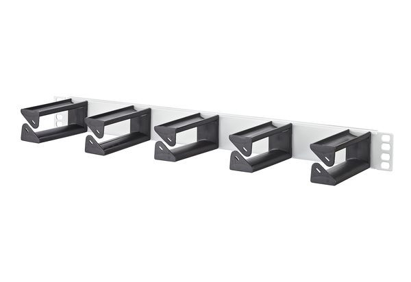Rangierfeld 19 Zoll 1HE, Kabelmanagement zum horizontalen rangieren der Patchkabel, Kabelführungsbügel 100,0 mm, besonders geeignet auch für LWL-Patchkabel, 5 schwarze Kabelführungsbügel aus Kunststoff mit großen Auflageflächen, einfache Montage der Kabelführungsbügel durch verdrehen, optional erhältlich: aufsteckbare Beschriftungsleiste , Kabelführungsbügel nicht vormontiert , Varianten: Stahl pulverbeschichtet grau oder schwarz, gebürstetes Aluminium silber eloxiert, Edelstahl