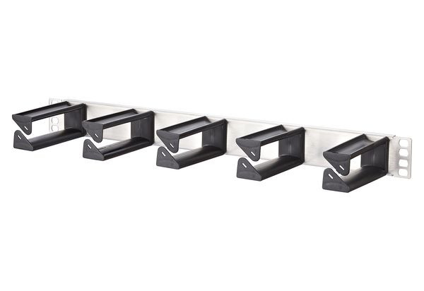 Rangierfeld 19 Zoll 1HE, Kabelmanagement zum horizontalen rangieren der Patchkabel, Kabelführungsbügel 100,0 mm, besonders geeignet auch für LWL-Patchkabel, 5 schwarze Kabelführungsbügel aus Kunststoff mit großen Auflageflächen, einfache Montage der Kabelführungsbügel durch verdrehen, optional erhältlich: aufsteckbare Beschriftungsleiste , Kabelführungsbügel nicht vormontiert , Varianten: Stahl pulverbeschichtet grau oder schwarz, gebürstetes Aluminium silber eloxiert, Edelstahl