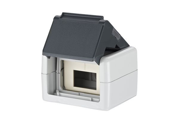 IP44-Aufputzgehäuse für zwei Einzelmodule in Keystonebauform , IP44-Schutz nur im geschlossenen Zustand (ohne gestecktes Patchkabel), Kabelzuführung für ein oder zwei Kabel von oben, bruchsicher, Farbe grau