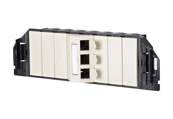 Anschlusseinheit zum Einbau in Geräteeinsätze im Unterflurbereich für Einzelmodule in Keystonebauform, passend zu Unterflur-Geräteeinsätzen von OBO Bettermann (Ackermann) und einzelne Typen von :hager (Electraplan Solutions), Bauform GB3, inkl. Modulträger für Keystone Module, Abdeckkappen und Blindabdeckungen, Steckrichtung der Module 45° nach oben geneigt, mit Sichtfenster für beiliegende Beschriftungseinlage, Beschriftungsbogen 209 x 294 mm siehe Zubehör, integrierte Staubschutzklappen (auch farbig erhältlich), Farbe: Gerätebecher schwarz, Abdeckteile perlweiß, Varianten: 3 Port, 6 Port, 9 Port, 12 Port