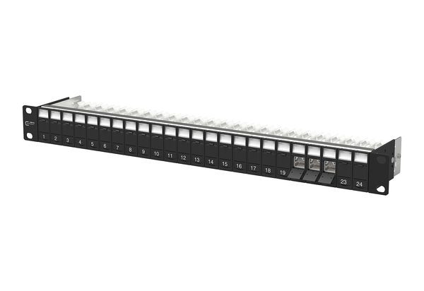 19 Zoll 1HE Modulträger mit 24 Einzelmodulen C6, Amodul K 180° schwarzGHMT Cat.6, A re-embedded PVP zertifiziertCat.6, A Komponentenprüfung nach ISO/IEC 11801, DIN EN 50173-1, ANSI/TIA-568.2-D und IEC 60603-7-51, GHMT zertifiziertEinhaltung der Klasse E, A bis 500 MHz nach ISO/IEC 11801, DIN EN 50173-1getestet: Komponente bis 600 MHz, Link bis 800 MHz, für 10GBit Ethernet (IEEE 802.3an), Remote Powering (PoE, PoE plus, UPoE und 4PPoE) und HDBaseT, SAT-IP, AVoverIP geeignet, Anschluss von Datenleitungen AWG 26/1 - 22/1 (eindrähtig) und AWG 26/7 bis 22/7 (mehrdrähtig) an IDC-Schneidklemmen, Spezialwerkzeug-freie Migration auf 25G-Systeme, Modulträgerfront aus schwarz eloxiertem Aluminium, Modulhalter aus schwarzem Kunststoff mit Staubschutzklappen (weitere Farben als Zubehör erhältlich) nach vorne entnehmbar, integrierte Kabelabfangung, zusätzliche Zugentlastung möglich, Sichtfenster für beiliegende Beschriftungseinlage, Beschriftungsbogen 210 x 297 mm siehe Zubehör, Erdungsbolzen M6 x 10 mit Mutter und Zahnscheibe, inkl. 30 cm Erdungskabel, alle vollgeschirmten Module mittels Erdungsschiene verbunden