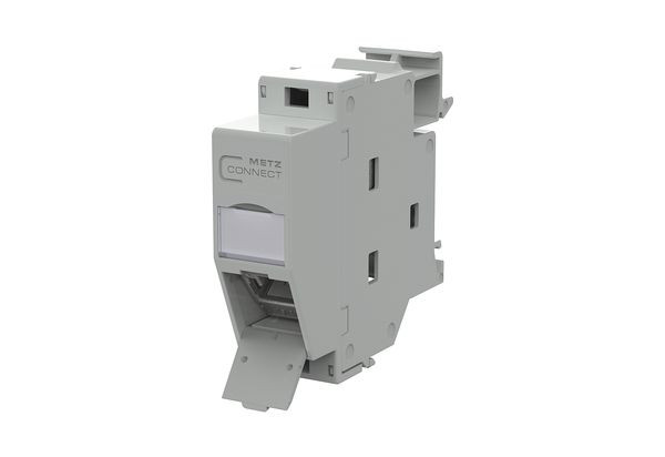 Anschlusseinheit zur Montage auf Tragschiene TH35 nach DIN EN 60715 in Elektroverteilern für Haus- und Industrieinstallation, neue METZ CONNECT FF Technologie, ohne Kunststofffolie verpackt (Easy Installation technology ? foil free) , bestückt mit einem C6, Amodul 270° K RJ45 EinzelmodulKabelzugang 45° von oben, Steckrichtung 45° nach unten geneigt, GHMT Cat.6, A re-embedded PVP zertifiziertCat.6, A Komponentenprüfung nach ISO/IEC 11801, DIN EN 50173-1, ANSI/TIA-568.2-D und IEC 60603-7-51, GHMT zertifiziertEinhaltung der Klasse E, A bis 500 MHz nach ISO/IEC 11801, DIN EN 50173-1getestet: Komponente bis 600 MHz, Link bis 800 MHz, für 10GBit Ethernet (IEEE 802.3an), Remote Powering (PoE, PoE plus, UPoE und 4PPoE) und HDBaseT, SAT-IP, AVoverIP geeignet, montagefreundlicher Anschluss von Datenleitungen AWG 26/1 - 22/1 (eindrähtig) und AWG 26/7 bis 22/7 (mehrdrähtig) an IDC-Schneidklemmen, Kennzeichnung der Adernbelegung T568A und T568B direkt auf dem Ladestück, die Baubreite von 1TE ermöglicht den Einbau von bis zu 12 REGplus in Standard-Elektroverteiler, Bei Einbau als Gerät der Schutzklasse I erfolgt der Potentialausgleich über ein integriertes Potentialausgleichsblech direkt über die Tragschiene, welche über entsprechende Kontaktierungsklemmen am Gebäudepotentialausgleich anzuschließen ist.Das Modul ist durch eine Abdeckung vor direkter Berührung geschützt. Bei Montage in schutzisolierten Verteilern bleibt die Schutzklasse II somit bestehen. Hierfür muss die Potentialausgleichsfeder entfernt werden.integrierte Staubschutzklappe (auch farbig erhältlich)