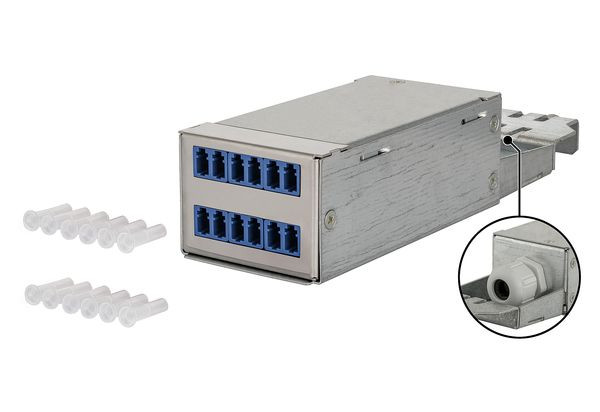 DCCS-Gehäuse mit 6 LC-Duplex-Kupplungen frontseitig montiert, Einfache Montage/Demontage in DCCS-Baugruppenträger (19 Zoll, 1 HE), Geeignet für den Einbau von vorkonfektionierten Installationskabeln (VIK) mit Mini-Breakoutkabel in kundenspezifischen Längen, Gehäuse: Stahlblech verzinkt, Front Edelstahl, Zugentlastung über M20-Kabelverschraubung, Varianten: blau (SM), grün (SM APC), lindgrün (OM5), violett (OM4), aqua (OM3), alle verfügbaren Varianten können über den Konfigurator erstellt werden