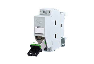 Anschlusseinheit mit einer E2000 DC Kupplung zur Montage auf Tragschiene TH35 nach DIN EN 60715, Führungshülse aus Zirkonoxydkeramik (ZrO, 2) geschlitzt, hohe Materialstabilität, Oberflächenqualität und Lebensdauer, Lebensdauer min. 1000 Steckzyklen, Kabelzugang 45° von oben, Steckrichtung 45° nach unten geneigt, die Baubreite von 1TE ermöglicht den Einbau von bis zu 12 REGs in Standard-Elektroverteiler, zum Einbau der Kupplung muss die vorhandene Staubschutzklappe entfernt werden, Varianten: blau (SM), grün (SM APC), beige (MM)