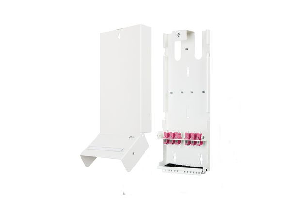 Consolidation Point VIK bestückt mit LC-D Kupplungen, zum Anschluss von vorkonfektionierten Installationskabeln VIKs mit max. 12 Fasern, Wandgehäuse aus Stahlblech, pulverbeschichtet (weiß, RAL 9010), Patchbereich mit aufklappbarer und abnehmbarer Abdeckung inkl. Beschriftungsfeld, Zugentlastungsmöglichkeit für Patchkabel, unbestückte Durchbrüche mit Blindstopfen verschlossen, Kabelmanagementbereich mit separater Abdeckung, Kabeleinführungsmöglichkeit rückseitig zur Aufnahme von einer PG16-Verschraubung, gegebenenfalls sind Erweiterungen bzw. Reduzierungen zur Befestigung der VIKs als separates Zubehör zu bestellen, Wandmontage-Zubehör inkl., Varianten: bestückt mit 6 LC-D Kupplungen lindgrün (OM5), violett (OM4), aqua (OM3), blau (OS2) oder grün (OS2 APC)