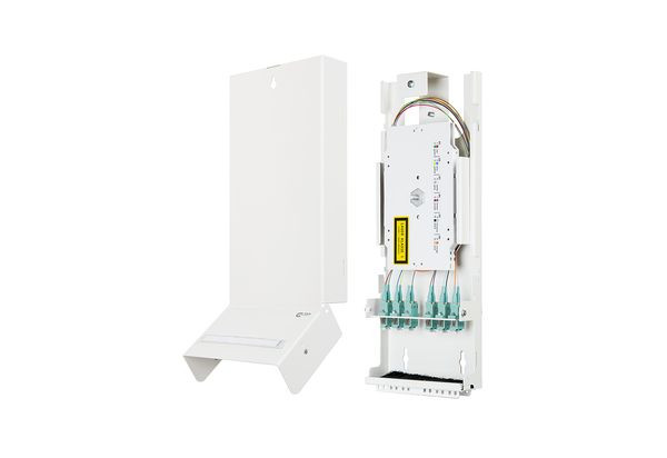 Consolidation Point splice bestückt, bestückt mit LC-D Kupplungen, Pigtails und Spleißkassette mit Crimpspleißschutzhalter, zum Anspleißen von Bündeladerkabeln, Wandgehäuse aus Stahlblech, pulverbeschichtet (weiß, RAL 9010), Patchbereich mit aufklappbarer und abnehmbarer Abdeckung inkl. Beschriftungsfeld, Zugentlastungsmöglichkeit für Patchkabel, unbestückte Durchbrüche mit Blindstopfen verschlossen, Kabelmanagementbereich mit separater Abdeckung, Kabeleinführungsmöglichkeit rückseitig zur Aufnahme von einer M20-Verschraubung, Wandmontage-Zubehör inkl.
