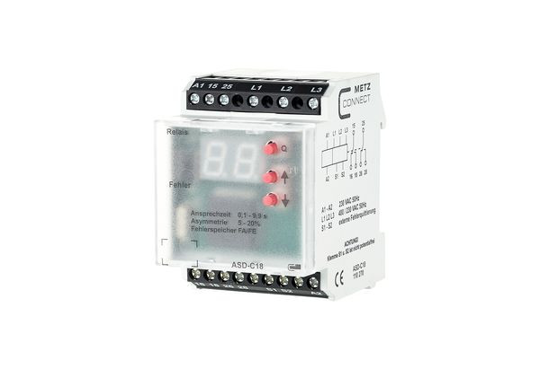 Überwachungsrelais zur Überwachung eines Drehstromanschlusses auf Asymmetrie, Phasenausfall, Phasenfolgefehler sowie Über- und Unterspannung. Mit externer Fehlerquittierung.Anschluss mit Schraubklemmen, Ansprechverzögerung einstellbar, Asymmetrie einstellbar, Fehlerspeicher wählbar, 7-Segment-Anzeigen