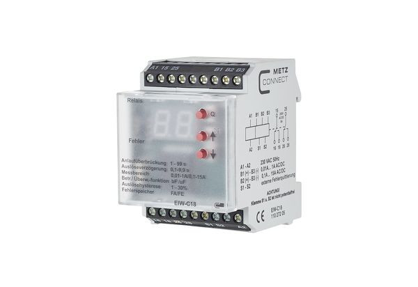 Überwachung von Gleich- oder Wechselströmen in spannungsführenden Anlagen. Es wird ein Über- oder Unterschreiten der eingestellten Werte angezeigt und ein Schaltvorgang ausgelöst. Die integrierte 7-Segment-Anzeige informiert über die Fehlerursachen. Über eine manuelle Eingabe am Gerät lassen sich die zu messende Stromart (AC oder DC), ein oberer und ein unterer Schwellwert, die Ansprechverzögerung sowie der Fehlerspeicher (ein oder aus) einstellen. Die zwei Strommessbereiche sind über die Anschlussklemmen wählbar. Eine Fehlerquittierung kann direkt am Gerät sowie über einen externen Kontakt erfolgen.Anschluss mit Schraubklemmen