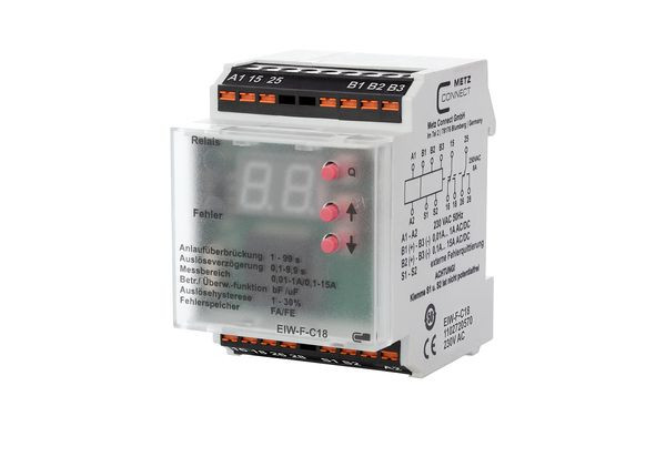 Überwachung von Gleich- oder Wechselströmen in spannungsführenden Anlagen. Es wird ein Über- oder Unterschreiten der eingestellten Werte angezeigt und ein Schaltvorgang ausgelöst. Die integrierte 7-Segment-Anzeige informiert über die Fehlerursachen. Über eine manuelle Eingabe am Gerät lassen sich die zu messende Stromart (AC oder DC), ein oberer und ein unterer Schwellwert, die Ansprechverzögerung sowie der Fehlerspeicher (ein oder aus) einstellen. Die zwei Strommessbereiche sind über die Anschlussklemmen wählbar. Eine Fehlerquittierung kann direkt am Gerät sowie über einen externen Kontakt erfolgen.Anschluss mit Federkraftklemmen (Push-In)