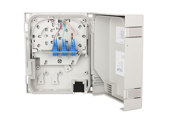 Glasfaser Spleiß-/Verteilgehäuse zum Einsatz als Hausübergabepunkt , bestückt mit LC-D Kupplungen und LC-Pigtails, Deckelverriegelung mittels Rasthaken mit Möglichkeit zur Plombierung., Deckel kann zur Erleichterung der Montage sehr einfach demontiert werden, Spleißkassette zur einfachen Montage und Wartung bei größtmöglichem Schutz der Fasern mit Auskreuzungsmöglichkeit und Faserüberlängenablage, mit oder ohne Schloss erhältlich, Zugentlastung für Kabel und Patchkabel, Montagemöglichkeit und Fixierung für Gas-/Wasserblocker vorhanden, Patchkabelausgang mit flexibler Lamellendichtung, zwei Kabeleinführungen für M20/25, eine M20-Verschraubung beiliegend, Befestigungsmöglichkeit für optische Koppler, strukturiertes ASA (Acrylester-Styrol-Acrylnitril) in RAL 7035, extrem widerstandsfähiger Kunststoff, schlagzäh und witterungsbeständig, Schutzklasse nach IEC 60529: IP 54 , Varianten: bestückt mit bis zu 6 LC-D Kupplungen und bis zu 12 LC-Pigtails, jeweils blau (OS2) oder LC-D APC, jeweils grün (OS2)