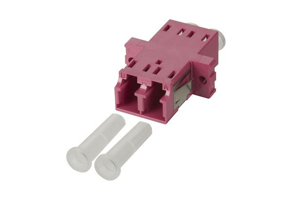 LC-Duplex-Kupplung aus Kunststoff, Bauform SC simplex mit Metall-Clip, geschlitzte Führungshülsen aus Keramik für Singlemode- und Multimode-Anwendungen, mit transparenten Staubschutzkappen für bessere Sichtbarkeit beim Rotlicht-Test, hohe Materialstabilität, Oberflächenqualität und Lebensdauer, Lebensdauer min. 1000 Steckzyklen bei Führungshülse aus Keramik, Schrauben und Muttern im Lieferumfang enthalten, Varianten: blau (OS2), grün (OS2 APC), lindgrün (OM5), violett (OM4), aqua (OM3), jeweils einzeln verpackt oder zu 50 Stück