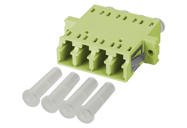 LC-Quad-Kupplung aus Kunststoff, Bauform SC duplex mit Metall-Clip, geschlitzte Führungshülsen aus Keramik für Singlemode- und Multimode-Anwendungen, mit transparenten Staubschutzkappen für bessere Sichtbarkeit beim Rotlicht-Test, hohe Materialstabilität, Oberflächenqualität und Lebensdauer, Lebensdauer min. 1000 Steckzyklen bei Führungshülse aus Keramik, Schrauben und Muttern im Lieferumfang enthalten, Varianten: blau (OS2), grün (OS2 APC), lindgrün (OM5), violett (OM4), aqua (OM3), jeweils einzeln verpackt oder zu 30 Stück