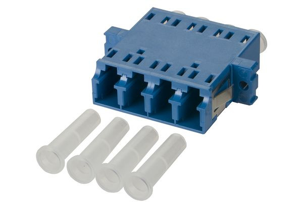 LC-Quad-Kupplung aus Kunststoff, Bauform SC duplex mit Metall-Clip, geschlitzte Führungshülsen aus Keramik für Singlemode- und Multimode-Anwendungen, mit transparenten Staubschutzkappen für bessere Sichtbarkeit beim Rotlicht-Test, hohe Materialstabilität, Oberflächenqualität und Lebensdauer, Lebensdauer min. 1000 Steckzyklen bei Führungshülse aus Keramik, Schrauben und Muttern im Lieferumfang enthalten, Varianten: blau (OS2), grün (OS2 APC), lindgrün (OM5), violett (OM4), aqua (OM3), jeweils einzeln verpackt oder zu 30 Stück