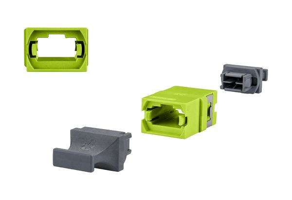 MTP® Kupplung aus Kunststoff, Farbe lindgrün für OM5, Bauform SC simplex mit Metall-Clip, ohne Flansch, mit zwei Staubschutzkappen, für Belegungsvariante Typ B (key up/key up = aligned), hohe Materialstabilität, Oberflächenqualität und Lebensdauer, Lebensdauer min. 500 Steckzyklen, Varianten: grün (OS2), lindgrün (OM5), violett (OM4), aqua (OM3), jeweils einzeln verpackt, MTP® ist ein eingetragenes Warenzeichen der Fa. US Conec Ltd., USA
