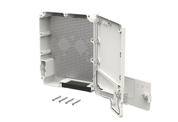 Verteilergehäuse für Kupfer- und Glasfaseranwendungen, bestückt mit Lochblech zur individuellen Montage verschiedener Geräte oder Hutschienen, maximale Bauhöhe der Geräte: 67 mm, 2 separat abschließbare Türen zur Trennung von Installateur- und Anwenderseite, Schutzklasse: IP54, gute Zugriffsmöglichkeiten und einfache Installation, Gehäuse sind anreihbar für größere Kapazitäten, Kabeleingänge: 12x M12/M16; 2x M20 und M25, geschlitzter Schaumstoff als flexibler Kabelausgang, plombierbar, kompaktes, schlichtes Design, Maße (L x B x H): 87,5 x 302,5 x 360,0 mm