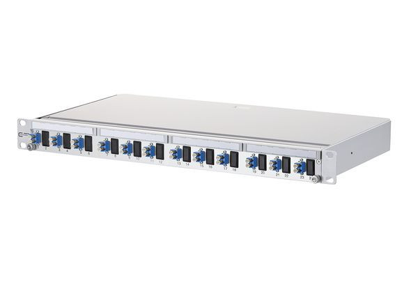 19 Zoll, 1HE LWL-Patchfeld mit ausziehbarer Spleißablage/Frontblende, bestückt mit LC-D Kupplungen, vorbereitet für den Einbau von vorkonfektionierten Installationskabeln (OpDAT VIK), leichte Aluminium-Konstruktion, nicht belegte Ausbrüche mit Blindstopfen verschlossen, Auszug zur besseren Montage abkipp- und komplett herausnehmbar (Auszugsstopp), variable Kabeleinführung (gerade/schräg) beidseitig möglich, Kabelabfangung mittels mitgeliefertem Kabelbinder oder optionaler Kabelverschraubung möglich, Kabeldurchmesser 3 bis 20 mm, Zugentlastung für Zentralelement/Kevlar, Kabelmanagement durch frei positionierbare Führungselemente, schraubenlose Abdeckung, Sichtfenster für beiliegende Beschriftungseinlagen, Varianten: bestückt mit 6, 12 oder 24 LC-D Kupplungen jeweils blau (OS2), lindgrün (OM5), violett (OM4) oder aqua (OM3) oder mit 6, 12 oder 24 LC-D APC Kupplungen jeweils grün (OS2)