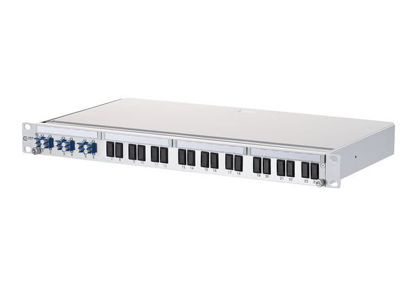 19 Zoll, 1HE LWL-Patchfeld mit ausziehbarer Spleißablage/Frontblende, bestückt mit LC-D Kupplungen, vorbereitet für den Einbau von vorkonfektionierten Installationskabeln (OpDAT VIK), leichte Aluminium-Konstruktion, nicht belegte Ausbrüche mit Blindstopfen verschlossen, Auszug zur besseren Montage abkipp- und komplett herausnehmbar (Auszugsstopp), variable Kabeleinführung (gerade/schräg) beidseitig möglich, Kabelabfangung mittels mitgeliefertem Kabelbinder oder optionaler Kabelverschraubung möglich, Kabeldurchmesser 3 bis 20 mm, Zugentlastung für Zentralelement/Kevlar, Kabelmanagement durch frei positionierbare Führungselemente, schraubenlose Abdeckung, Sichtfenster für beiliegende Beschriftungseinlagen, Varianten: bestückt mit 6, 12 oder 24 LC-D Kupplungen jeweils blau (OS2), lindgrün (OM5), violett (OM4) oder aqua (OM3) oder mit 6, 12 oder 24 LC-D APC Kupplungen jeweils grün (OS2)