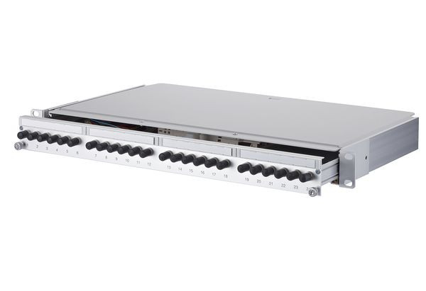 19 Zoll, 1HE LWL-Patchfeld mit ausziehbarer Spleißablage/Frontblende (grau oder schwarz), bestückt mit ST-Kupplungen und ST-Pigtails, Pigtails mit Kompaktader ø 0,9 mm, 12 Farben, Sekundär- und Primärcoating gleichgefärbt, Länge 2,0 m, Pigtails in Standardspleißkassette mit Crimpspleißhaltern eingelegt und abgesetzt, Pigtails gereinigt und in Kupplungen eingesteckt, Auszug zur besseren Montage abkipp- und komplett herausnehmbar (Auszugsstopp), leichte Aluminium-Konstruktion, nicht belegte Ausbrüche mit Blindstopfen verschlossen, variable Kabeleinführung (gerade/schräg) beidseitig möglich, Kabelabfangung mittels mitgeliefertem Kabelbinder oder optionaler Kabelverschraubung möglich, Kabeldurchmesser 3 bis 20 mm, Zugentlastung für Zentralelement/Kevlar, Kabelmanagement durch frei positionierbare Führungselemente, schraubenlose Abdeckung, Sichtfenster für beiliegende Beschriftungseinlagen, Varianten: bestückt mit 12 oder 24 ST Kupplungen und Pigtails jeweils metallisch (OS2, OM4 oder OM3)