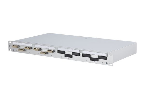 19 Zoll, 1HE LWL-Patchfeld für Festeinbau, bestückt mit SC-D-Kupplungen, vorbereitet für den Einbau von vorkonfektionierten Installationskabeln (OpDAT VIK), leichte Konstruktion mit Frontplatte (grau oder schwarz) und Gehäuse aus Aluminium, nicht belegte Ausbrüche mit Blindstopfen verschlossen, abnehmbare Frontplatte zur einfachen Adaptermontage, in der Rückwand befinden sich 10 Kabeleinführungsmöglichkeiten zur Aufnahme von 4xPG13,5-, 2x PG16/M20- oder 2x PG21/M25-Verschraubungen und zur Aufnahme von 2 Vorkonfektionierten Installationskabeln (VIK), servicefreundliche, rastbare Abdeckung, Sichtfenster für beiliegende Beschriftungseinlagen, Varianten: bestückt mit 6 oder 12 SC-D Kupplungen jeweils blau (OS2), lindgrün (OM5), violett (OM4), aqua (OM3) oder 6 oder 12 SC-D APC Kupplungen grün (OS2)