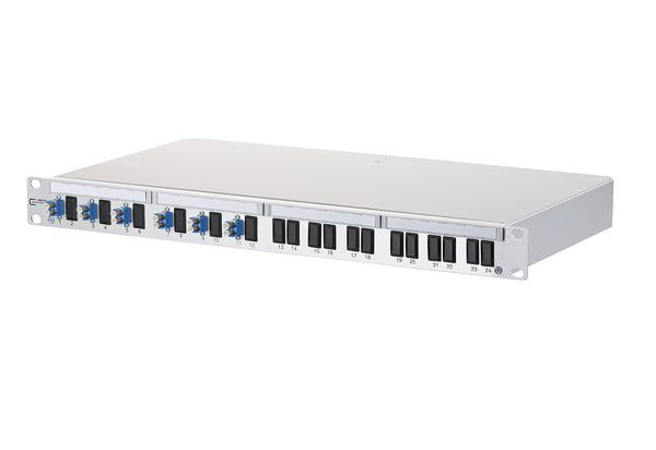 19 Zoll, 1HE LWL-Patchfeld für Festeinbau, bestückt mit LC-D Kupplungen und LC-Pigtails, Pigtails mit Kompaktader ø 0,9 mm, 12 Farben, Sekundär- und Primärcoating gleichgefärbt, Länge 2,0 m, Pigtails in Standardspleißkassette mit Crimpspleißhaltern eingelegt und abgesetzt, Pigtails gereinigt und in Kupplungen eingesteckt, leichte Konstruktion mit Frontplatte (grau oder schwarz) und Gehäuse aus Aluminium, nicht belegte Ausbrüche mit Blindstopfen verschlossen, abnehmbare Frontplatte zur einfachen Adaptermontage, in der Rückwand befinden sich 10 Kabeleinführungsmöglichkeiten zur Aufnahme von 4x PG13,5-, 2x PG16/M20- oder 2x PG21/M25-Verschraubungen und zur Aufnahme von 2 Vorkonfektionierten Installationskabeln (VIK), servicefreundliche, rastbare Abdeckung, Sichtfenster für beiliegende Beschriftungseinlagen, eine Kabeleinführung M20 ist beigelegt, Varianten: bestückt mit 6, 12 oder 24 LC-D Kupplungen und Pigtails jeweils blau (OS2), violett (OM4), aqua (OM3), oder 6, 12 oder 24 LC-D APC Kupplungen und Pigtails grün (OS2)