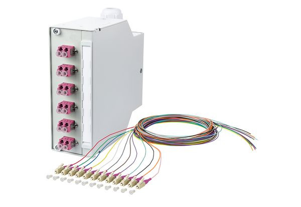 Kompaktes Verteilergehäuse für TH35-Tragschienensysteme, Geeignet zum Spleißen von Installationskabeln, leichteres Handling durch einzelne Pigtails, bestückt mit LC-D Kupplungen , Pigtails im Blister beigelegt, Pigtails mit Kompaktader ø 0,9 mm, 12 Farben, Sekundär- und Primärcoating gleichgefärbt, Länge 2,0 m, Frontbereich mit Beschriftungsstreifen, Verschiedene Montagepositionen am Hutschienensystem möglich, Kabelzuführung von oben oder unten, gerade oder schräg, mit M20-Verschraubung (bis zu 2 möglich), Eine Kabeleinführung M20 mit Zugentlastung im Lieferumfang enthalten, Freie Kupplungsaussparungen mit Blindabdeckungen bestückt, Gehäuse aus Stahlblech, pulverbeschichtet (lichtgrau, RAL 7035), Varianten: bestückt mit maximal 6 LC-D Kupplungen
