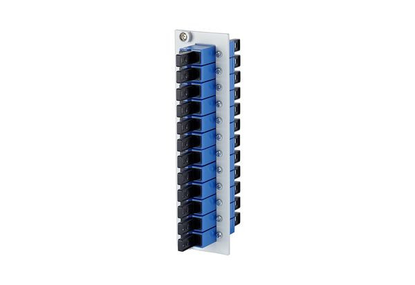 Frontplatte 3HE/7TE mit 12 E2000 Kupplungen, Führungshülse aus Keramik geschlitzt für Singlemode Anwendungen, geeignet für den Einbau in OpDAT REGpro und OpDAT REG S, Stahlblech pulverbeschichtet, grau, Varianten: bestückt mit 12 E2000 Kupplungen, jeweils blau (OS2) oder E2000 APC Kupplungen, jeweils grün (OS2)