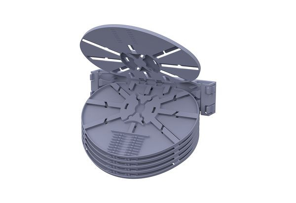Single Circuit Kassettenblock mit 6 einzelnen Spleißkassetten, jede Spleißkassette für 12x Crimpspleißhalter, Spleißkassetten einzeln entnehmbar, geschützte Aderführung in die Spleißkassetten
