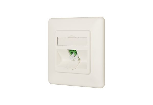 Unterputz-Anschlusseinheit, bestückt mit einer OpDAT modul LC-D SM APC Kupplung (grün) mit Adapter, Führungshülse aus Keramik geschlitzt, Lebensdauer min. 1000 Steckzyklen, Steckrichtung des Moduls 45° nach unten geneigt, Zugentlastung des Kevlars durch Schraube am Modulträger, Klettband zur Bündelung des Faservorrats, mit Sichtfenster für beiliegende Beschriftungseinlage, Beschriftungsbogen 209 x 294 mm siehe Zubehör, integrierte Staubschutzklappen (auch farbig erhältlich), Abdeckteile reinweiß RAL 9010, Oberfläche matt strukturiert, kompatibel zu Design-Zentralstücken von Schalterprogrammen