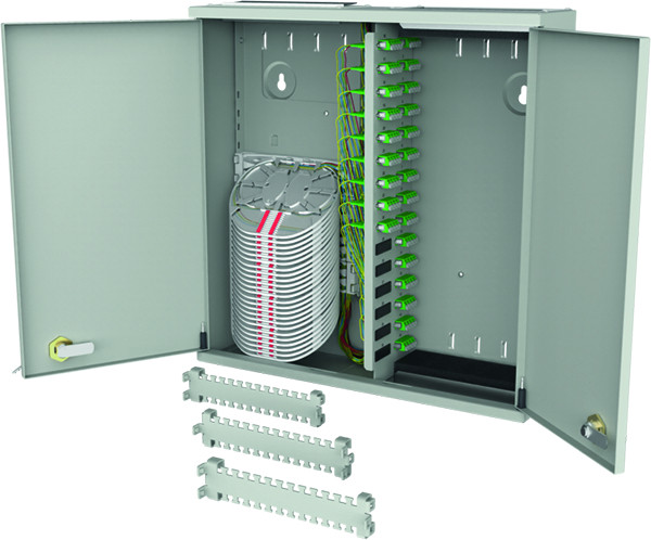 LWL-Verteiler zum Einsatz als Hausverteilpunkt im Technikraum von Mehrfamilienhäusern. Inklusive 24 Spleißkassetten für 24 WE, jede Wohneinheit lässt sich in einer separaten Spleißkassette ablegen. Aufputzgehäuse mit zwei abschließbaren Schwenktüren und zwei verschiedenen Schlössern für die Trennung zwischen Netz- und Gebäudeverkabelung. Jede Spleißkassette ist mit 4 Pigtails spleißfertig vorbereitet. Jede Kupplung ist einer Wohneinheit und einer Spleißkassette zuordbar. Innovative stapelbare Kabelabfangung für bis zu 30 Kabel mit max. Ø 4,5mm. Bürstenleiste als Kabelausgang zur Gebäudeverkabelung. Schaumstoff zur staubfreien Einführung der Patchkabel von der Netzwerkseite. Maße: 405 x 400 x 107 mm.