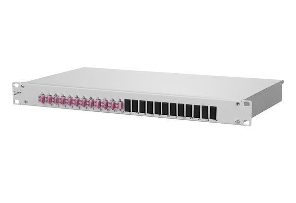 19 Zoll, 1HE LWL-Patchfeld für Festeinbau, bestückt mit LC-D-Kupplungen, vorbereitet für den Einbau von vorkonfektionierten Installationskabeln (OpDAT VIK), leichte Aluminium-Konstruktion mit Stahlblech Frontplatte (grau oder schwarz), nicht belegte Ausbrüche mit Blindstopfen verschlossen, abnehmbare Frontplatte zur einfachen Kupplungsmontage, servicefreundliche, verschraubte Abdeckung, mehrere Kabeleingangsmöglichkeiten rückseitig (Befestigung mit PG13,5, PG16 und PG21 bzw. M20 und M25), werkzeuglose Befestigung von vorkonfektionierten Installationskabeln (OpDAT VIK) in einem U-Ausschnitt, Varianten: bestückt mit 6, 12 oder 24 LC-D Kupplungen jeweils blau (OS2), lindgrün (OM5), violett (OM4), aqua (OM3) oder 6, 12 oder 24 LC-D APC Kupplungen jeweils grün (OS2)