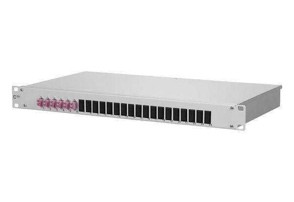 19 Zoll, 1HE LWL-Patchfeld für Festeinbau, bestückt mit LC-D-Kupplungen, vorbereitet für den Einbau von vorkonfektionierten Installationskabeln (OpDAT VIK), leichte Aluminium-Konstruktion mit Stahlblech Frontplatte (grau oder schwarz), nicht belegte Ausbrüche mit Blindstopfen verschlossen, abnehmbare Frontplatte zur einfachen Kupplungsmontage, servicefreundliche, verschraubte Abdeckung, mehrere Kabeleingangsmöglichkeiten rückseitig (Befestigung mit PG13,5, PG16 und PG21 bzw. M20 und M25), werkzeuglose Befestigung von vorkonfektionierten Installationskabeln (OpDAT VIK) in einem U-Ausschnitt, Varianten: bestückt mit 6, 12 oder 24 LC-D Kupplungen jeweils blau (OS2), lindgrün (OM5), violett (OM4), aqua (OM3) oder 6, 12 oder 24 LC-D APC Kupplungen jeweils grün (OS2)
