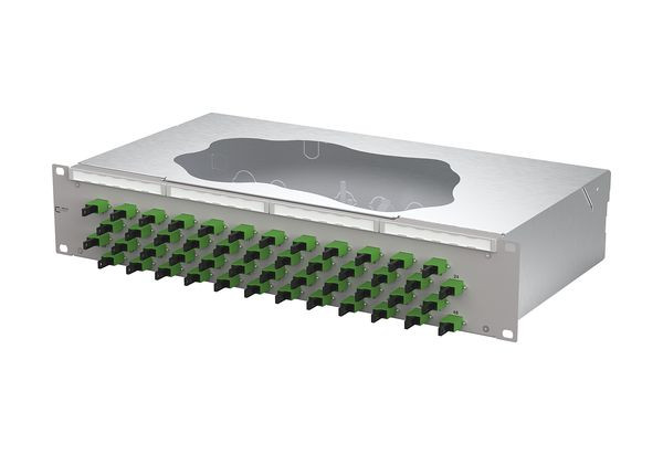 19 Zoll, 2HE Patchfeld zum Festeinbau, Bestückt mit 48xE2000-S Kupplungen und 48xE2000-S APC OS2 Pigtails, Versetzte Kupplungsanordnung für ein einfaches Handling, Pigtails in Standardspleißkassette mit Crimpspleißhaltern eingelegt und abgesetzt, Pigtail visuell geprüft und in Kupplungen eingesteckt, Farbcodierung nach IEC 60304, Frontplatte mit Beschriftungsfeld, Frontplatte pulverbeschichtet in grau RAL 7035, Werkzeugloses Öffnen des Deckels, Mehrere Kabeleingangsmöglichkeiten rückseitig: 6xM20; 2xM25; 2xVIK-Einbauausschnitte