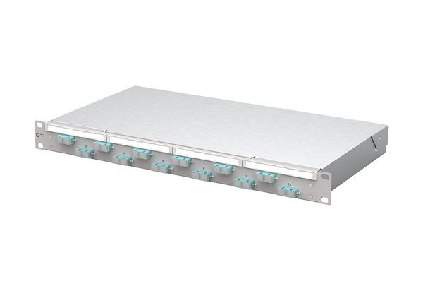 19 Zoll, 1HE Patchfeld zum Festeinbau, Bestückt mit 12xSC-D Kupplungen, Versetzte Kupplungsanordnung für ein einfaches Handling, Frontplatte mit Beschriftungsfeld, Frontplatte pulverbeschichtet in grau RAL 7035, Werkzeugloses Öffnen des Deckels, Mehrere Kabeleingangsmöglichkeiten rückseitig: 6xM20; 2xM25; 2xVIK-Einbauausschnitte, Vorbereitet für den Einbau von vorkonfektionierten Leitungen