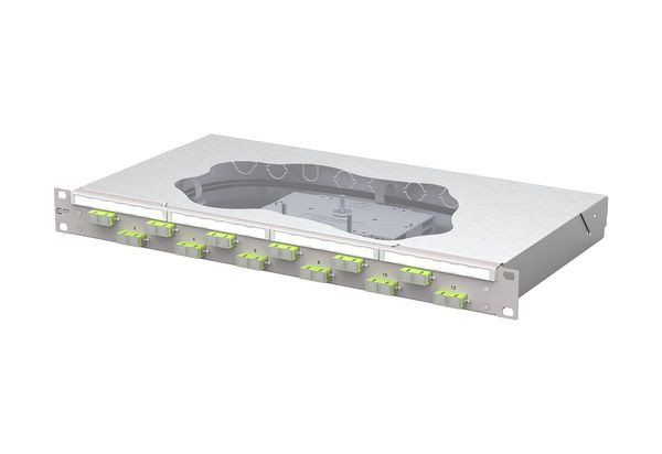 19 Zoll, 1HE Patchfeld zum Festeinbau, Bestückt mit 12xSC-D Kupplungen und 24xSC-D OM5 Pigtails, Versetzte Kupplungsanordnung für ein einfaches Handling, Pigtails in Standardspleißkassette mit Crimpspleißhaltern eingelegt und abgesetzt, Pigtail visuell geprüft und in Kupplungen eingesteckt, Farbcodierung nach IEC 60304, Frontplatte mit Beschriftungsfeld, Frontplatte pulverbeschichtet in grau RAL 7035, Werkzeugloses Öffnen des Deckels, Mehrere Kabeleingangsmöglichkeiten rückseitig: 6xM20; 2xM25; 2xVIK-Einbauausschnitte