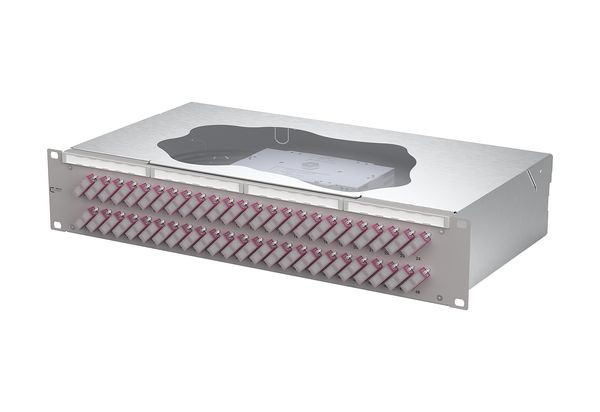 19 Zoll, 2HE Patchfeld zum Festeinbau, Bestückt mit 48xSC-D Kupplungen und 96xSC-D OM4 Pigtails, Kupplungsanordnung schräg, Pigtails in Standardspleißkassette mit Crimpspleißhaltern eingelegt und abgesetzt, Pigtail visuell geprüft und in Kupplungen eingesteckt, Farbcodierung nach IEC 60304, Frontplatte mit Beschriftungsfeld, Frontplatte pulverbeschichtet in grau RAL 7035, Werkzeugloses Öffnen des Deckels, Mehrere Kabeleingangsmöglichkeiten rückseitig: 6xM20; 2xM25; 2xVIK-Einbauausschnitte