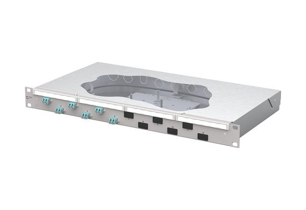 19 Zoll, 1HE Patchfeld zum Festeinbau, Bestückt mit 6xLC-D Kupplungen und 12xLC-D OM3 Pigtails, Versetzte Kupplungsanordnung für ein einfaches Handling, Pigtails in Standardspleißkassette mit Crimpspleißhaltern eingelegt und abgesetzt, Pigtail visuell geprüft und in Kupplungen eingesteckt, Farbcodierung nach IEC 60304, Frontplatte mit Beschriftungsfeld, Frontplatte pulverbeschichtet in grau RAL 7035, Werkzeugloses Öffnen des Deckels, Mehrere Kabeleingangsmöglichkeiten rückseitig: 6xM20; 2xM25; 2xVIK-Einbauausschnitte