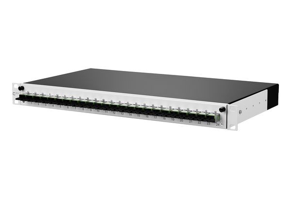 19 Zoll, 1HE LWL-Patchfeld ausziehbarer Spleißablage/Frontblende (grau oder schwarz), bestückt mit E2000-D Kupplungen und E2000-Pigtails, Pigtails mit Kompaktader ø 0,9 mm, 12 Farben, Sekundär- und Primärcoating gleichgefärbt, Länge 2,0 m, Pigtails in Standardspleißkassette mit Crimpspleißhaltern eingelegt und abgesetzt, Pigtails gereinigt und in Kupplungen eingesteckt, Auszug zur besseren Montage abkipp- und komplett herausnehmbar (Auszugsstopp), nicht belegte Ausbrüche mit Blindstopfen verschlossen, mehrere Kabeleingangsmöglichkeiten rückseitig (Befestigung mit PG13,5, PG16 und PG21 bzw. M20 und M25), eine Kabeleinführung M20 ist beigelegt, Varianten: bestückt mit 12 oder 24 E2000-D Kupplungen und Pigtails jeweils blau (OS2) oder 12 oder 24 E2000-D APC Kupplungen und Pigtails jeweils grün (OS2)