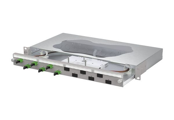 19 Zoll, 1HE Patchfeld mit ausziehbarer Schublade, Bestückt mit 6xE2000-S Kupplungen und 6xE2000-S APC OS2 Pigtails, Versetzte Kupplungsanordnung für ein einfaches Handling, Pigtails in Standardspleißkassette mit Crimpspleißhaltern eingelegt und abgesetzt, Pigtail visuell geprüft und in Kupplungen eingesteckt, Farbcodierung nach IEC 60304, Werkzeugloser Metall-Bajonettverschluss zum Verriegeln der Schublade, Auszug zur besseren Montage abkippbar und komplett herausnehmbar (Auszugsstop), 30 mm tiefenverstellbar, Frontplatte mit Beschriftungsfeld, Frontplatte pulverbeschichtet in grau RAL 7035, Mehrere Kabeleingangsmöglichkeiten rückseitig: 6xM20; 2xM25; 2xVIK-Einbauausschnitte
