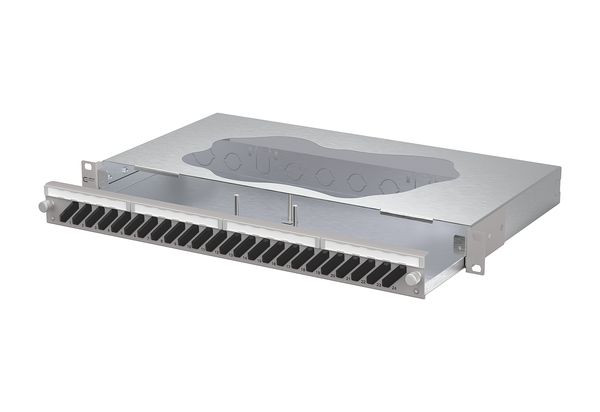 19 Zoll, 1HE Patchfeld mit ausziehbarer Schublade, Unbestückt, Werkzeugloser Metall-Bajonettverschluss zum Verriegeln der Schublade, Auszug zur besseren Montage abkippbar und komplett herausnehmbar (Auszugsstop), 30 mm tiefenverstellbar , Frontplatte mit Beschriftungsfeld , Frontplatte pulverbeschichtet in grau RAL 7035, Mehrere Kabeleingangsmöglichkeiten rückseitig: 6xM20; 2xM25; 2xVIK-Einbauausschnitte