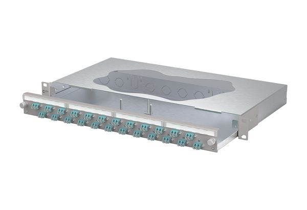 19 Zoll, 1HE Patchfeld mit ausziehbarer Schublade, Bestückt mit 24xLC-D Kupplungen, Versetzte Kupplungsanordnung für ein einfaches Handling, Werkzeugloser Metall-Bajonettverschluss zum Verriegeln der Schublade, Auszug zur besseren Montage abkippbar und komplett herausnehmbar (Auszugsstop), 30 mm tiefenverstellbar, Frontplatte mit Beschriftungsfeld, Frontplatte pulverbeschichtet in grau RAL 7035, Mehrere Kabeleingangsmöglichkeiten rückseitig: 6xM20; 2xM25; 2xVIK-Einbauausschnitte, Vorbereitet für den Einbau von vorkonfektionierten Leitungen
