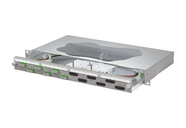 19 Zoll, 1HE Patchfeld mit ausziehbarer Schublade, Bestückt mit 6xSC-D Kupplungen und 12xSC-D APC OS2 Pigtails, Versetzte Kupplungsanordnung für ein einfaches Handling, Pigtails in Standardspleißkassette mit Crimpspleißhaltern eingelegt und abgesetzt, Pigtail visuell geprüft und in Kupplungen eingesteckt, Farbcodierung nach IEC 60304, Werkzeugloser Metall-Bajonettverschluss zum Verriegeln der Schublade, Auszug zur besseren Montage abkippbar und komplett herausnehmbar (Auszugsstop), 30 mm tiefenverstellbar, Frontplatte mit Beschriftungsfeld, Frontplatte pulverbeschichtet in grau RAL 7035, Mehrere Kabeleingangsmöglichkeiten rückseitig: 6xM20; 2xM25; 2xVIK-Einbauausschnitte
