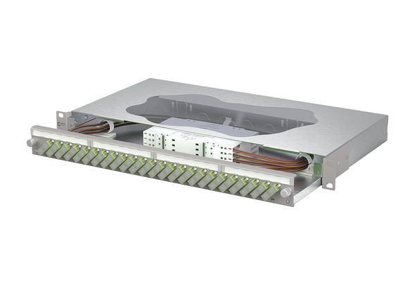 19 Zoll, 1HE Patchfeld mit ausziehbarer Schublade, Bestückt mit 24xSC-D Kupplungen und 48xSC-D OM5 Pigtails, Kupplungsanordnung schräg, Pigtails in Standardspleißkassette mit Crimpspleißhaltern eingelegt und abgesetzt, Pigtail visuell geprüft und in Kupplungen eingesteckt, Farbcodierung nach IEC 60304, Werkzeugloser Metall-Bajonettverschluss zum Verriegeln der Schublade, Auszug zur besseren Montage abkippbar und komplett herausnehmbar (Auszugsstop), 30 mm tiefenverstellbar, Frontplatte mit Beschriftungsfeld, Frontplatte pulverbeschichtet in grau RAL 7035, Mehrere Kabeleingangsmöglichkeiten rückseitig: 6xM20; 2xM25; 2xVIK-Einbauausschnitte