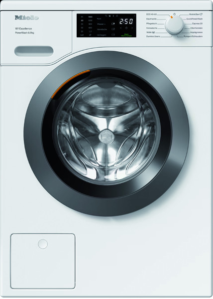 DirectSensor Display, Startvorwahl bis zu 24 Std., Restzeitanzeige, Summer, PowerWash, CapDosing, Mengenautomatik, Schaumregulierung, Wassermengenzähler, AddLoad (Nachlegen nach Programmstart), Optionen: Kurz, Vorwäsche, Wasser plus, Zusätzlicher Spülgang, Vorbügeln mit Dampf; Niedrigtemperaturwaschen "kalt" und "20°C", Waschprogramme: QuickPowerWash, Baumwolle, Pflegeleicht, Feinwäsche, Oberhemden, Wolle (Handwäsche), Express 20, Dunkles/Jeans, Imprägnieren, Pumpen/Schleudern, ECO 40-60; AutoClean Einspülkasten, Waterproof-System, Kindersicherung, PIN-Code Verriegelung, optische Schnittstelle, Miele@home, Tür Graphitgrau Pearlfinish, ProfiEco Motor, säulenfähig